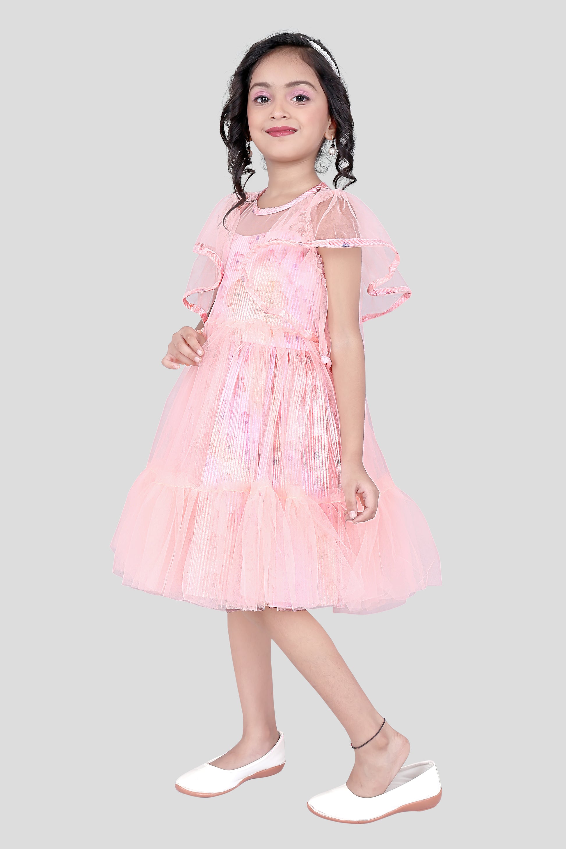 This charming peach dress with Bag for girls exudes elegance and sweetness. It features a layered, tulle skirt that adds volume and movement, making it ideal for twirling. The bodice is adorned with delicate floral patterns, adding a soft and feminine touch. Sheer flutter sleeves provide an airy, whimsical feel, and a round neckline completes the look. The dress is perfect for special occasions like birthdays, weddings, or parties, where your little one will stand out in style. Paired with white ballet flats, this outfit combines comfort and grace effortlessly.