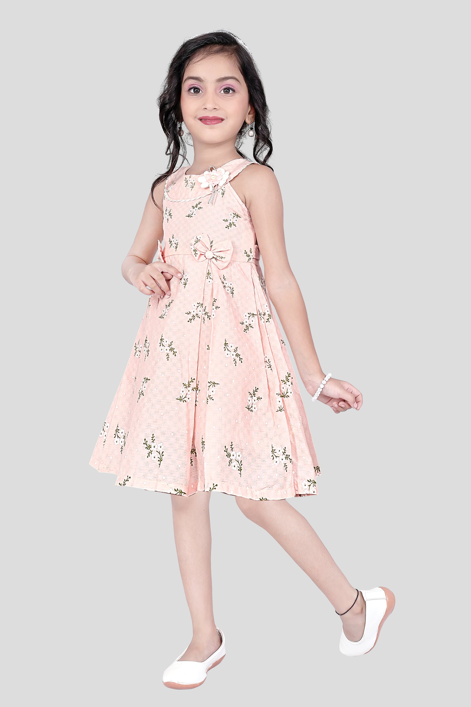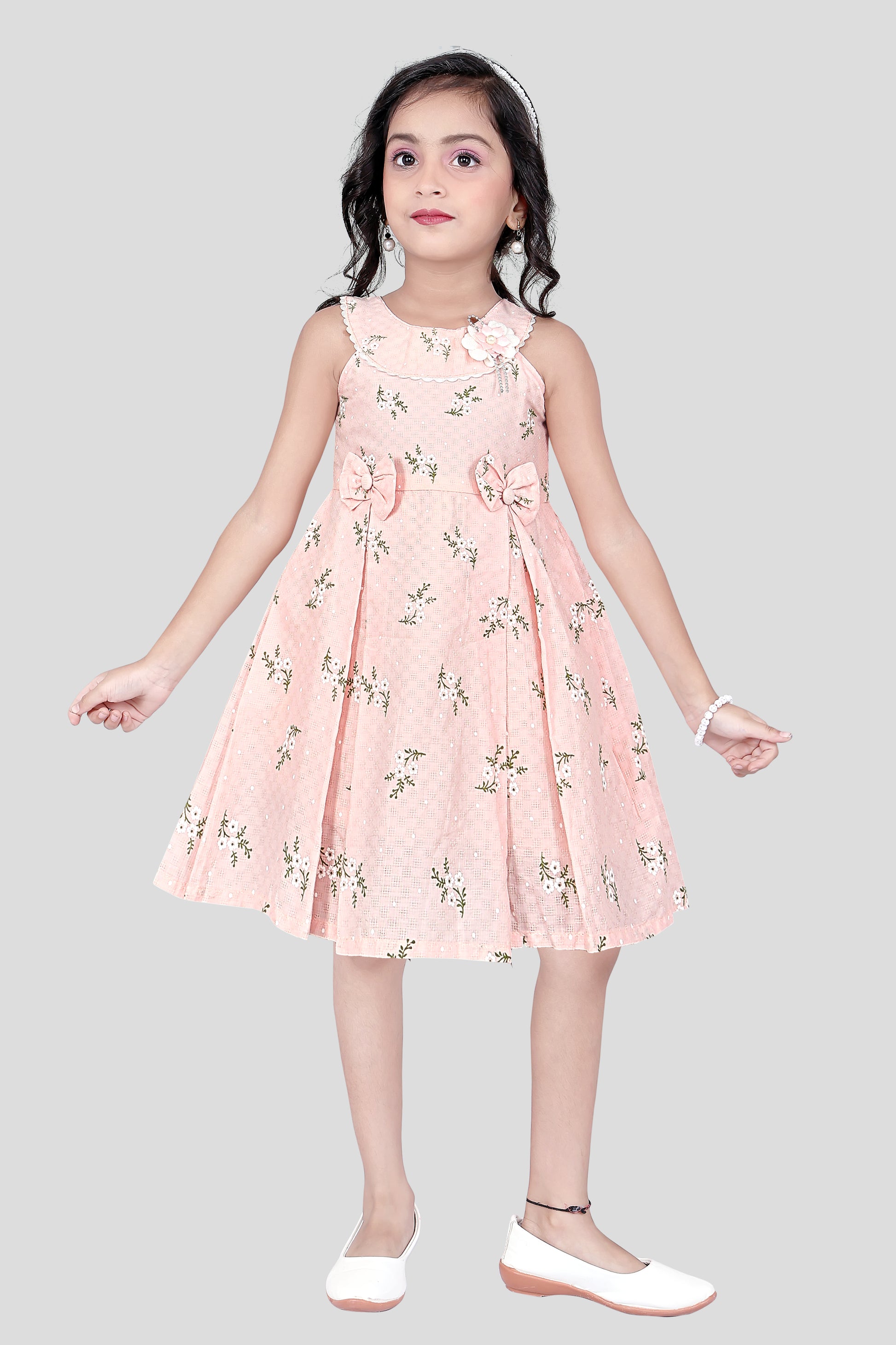 This lovely pastel peach Pure Cotton dress for girls features a delicate floral print, exuding charm and grace. The sleeveless design is complemented by a round neckline adorned with subtle lace detailing, adding a refined touch. Two decorative bows on the waistline enhance its playful look, while soft pleats create a gently flared skirt perfect for twirling. With its pure Cotton lightweight, breathable fabric, this dress is ideal for spring and summer events, including birthday parties, family gatherings, or casual outings.