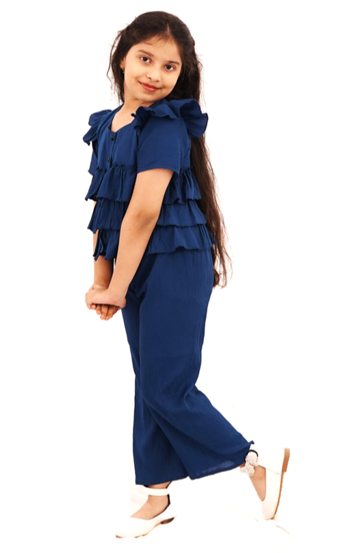 Top: The short-sleeved ruffled top is typically made of lightweight, breathable fabric, It features soft, flowing ruffles around the neckline or sleeve edges, adding a touch of femininity and movement to the look. The top may be slightly loose or tailored for a relaxed fit, offering both comfort and versatility. It could come in Blue colors or patterns like solid.
