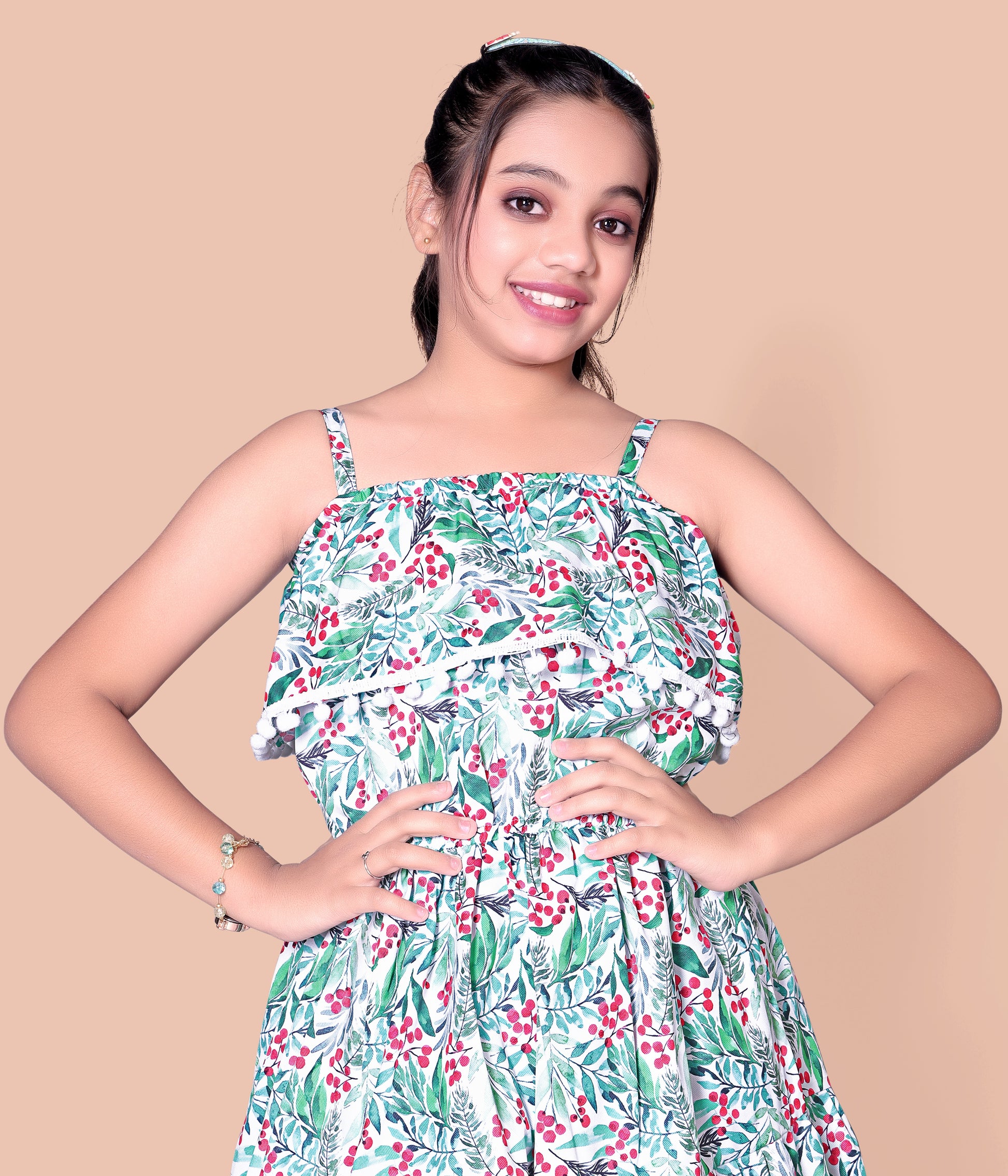 Green And Red Cherry Printed Frock With Shoulder Stripe