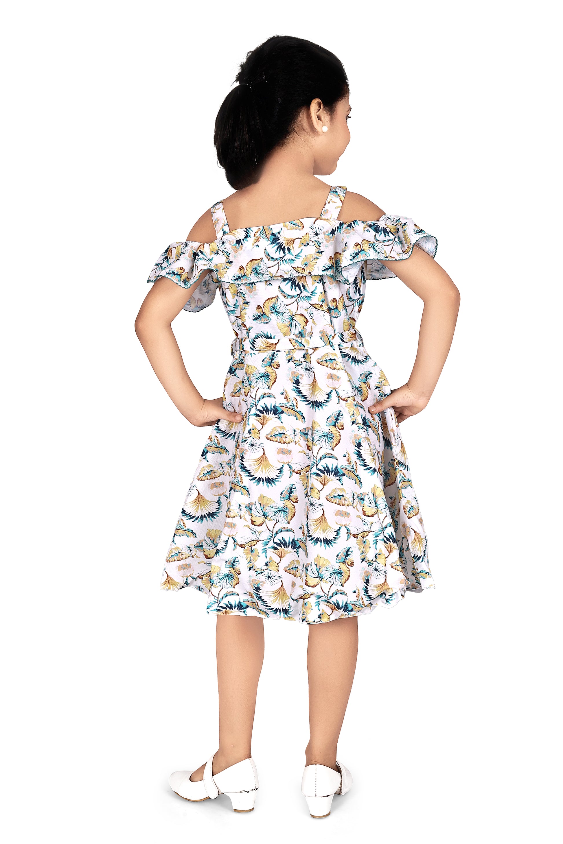 Green colour leaves off shoulder A-Line dress with front open and has all over wooden buttons and self fabric belt for better fitting and also has comfortable and breathable lining for your Fabangel.