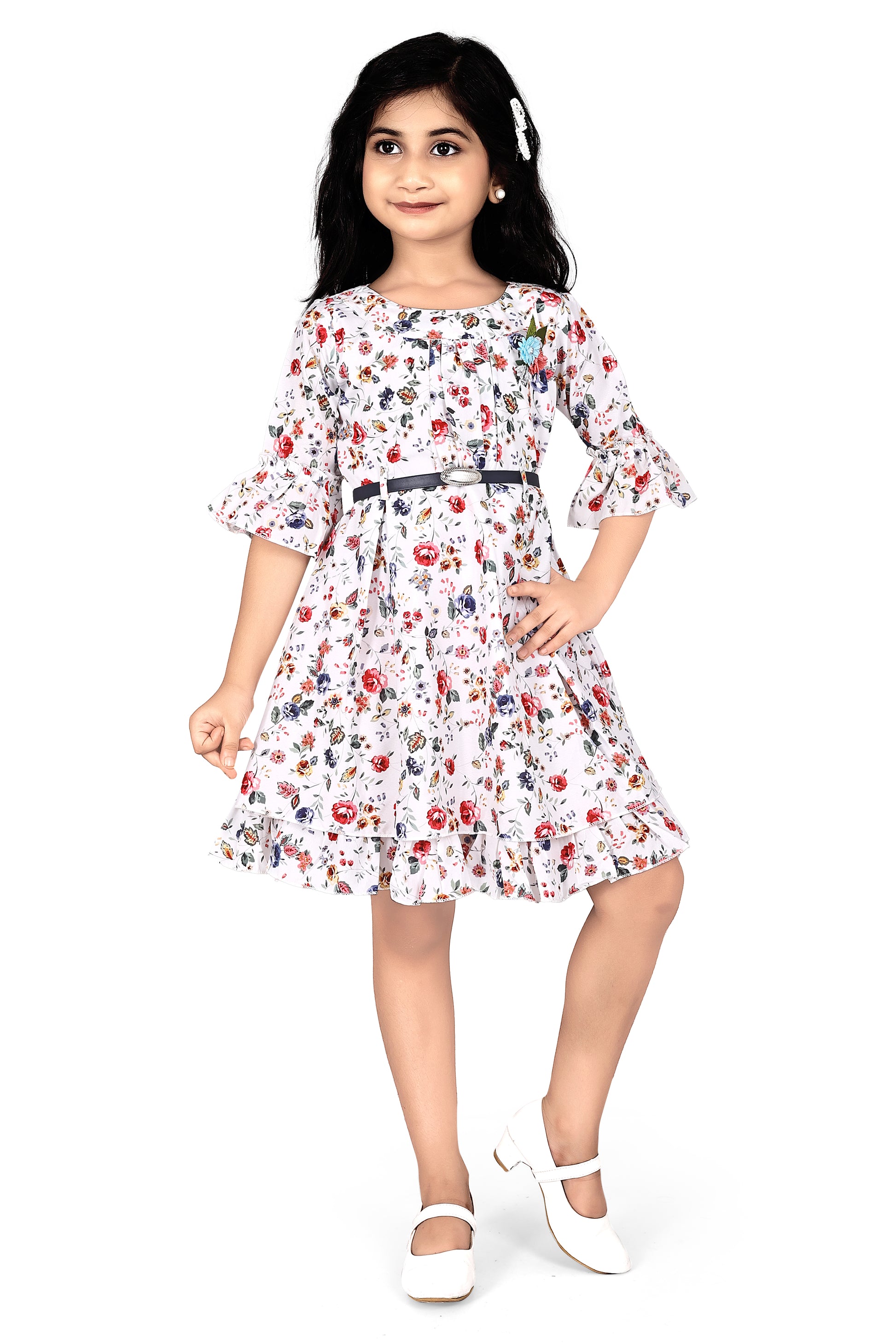 Beautiful multicolour flower pleated dress with 3/4 th sleeves. It has leather belt for better fitting.