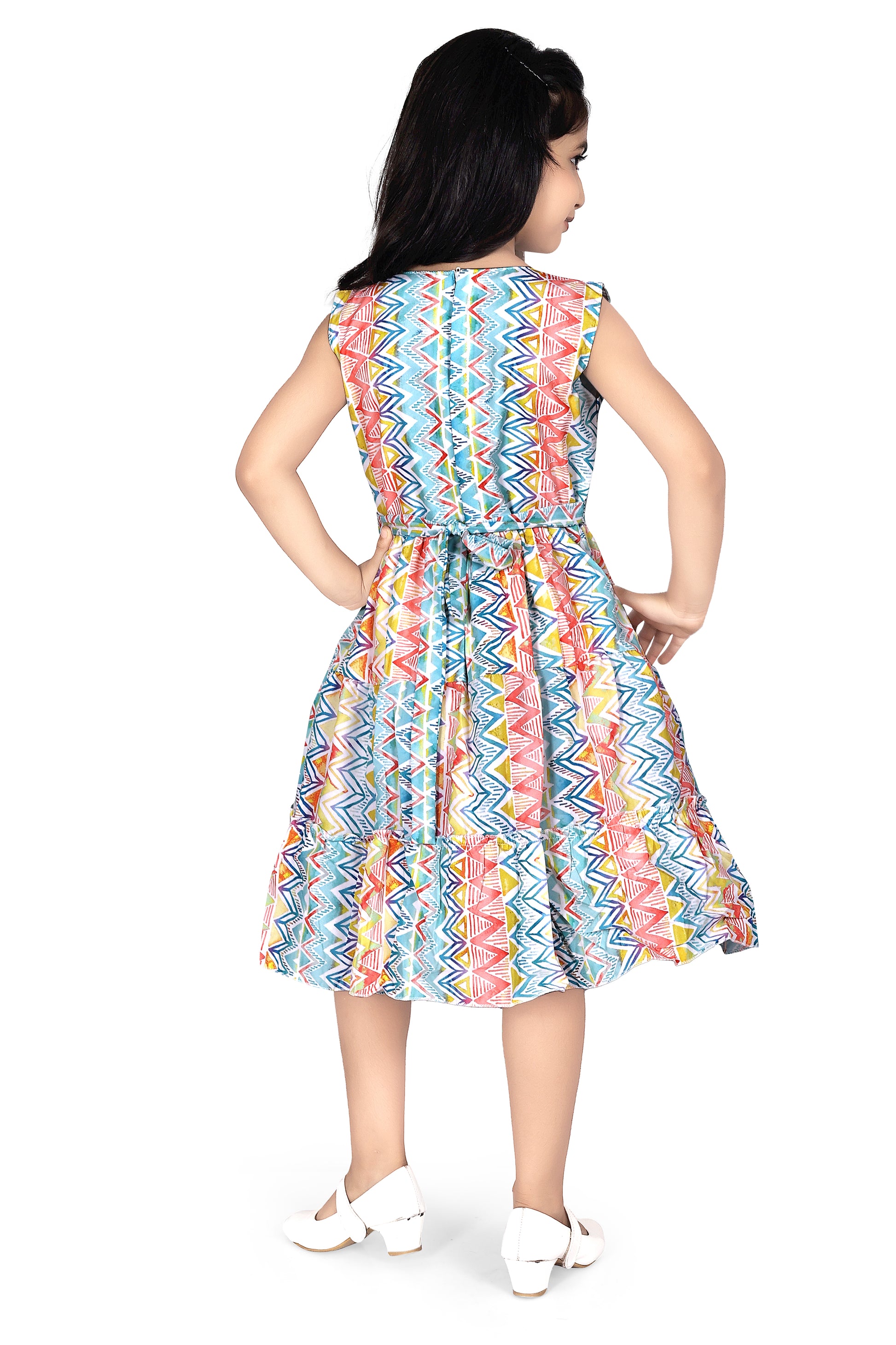 Multicolour zigzag lines elegant frock for casual wear. Extra sleeves attached. It comes with comfortable and breathable lining for your Fabangels.