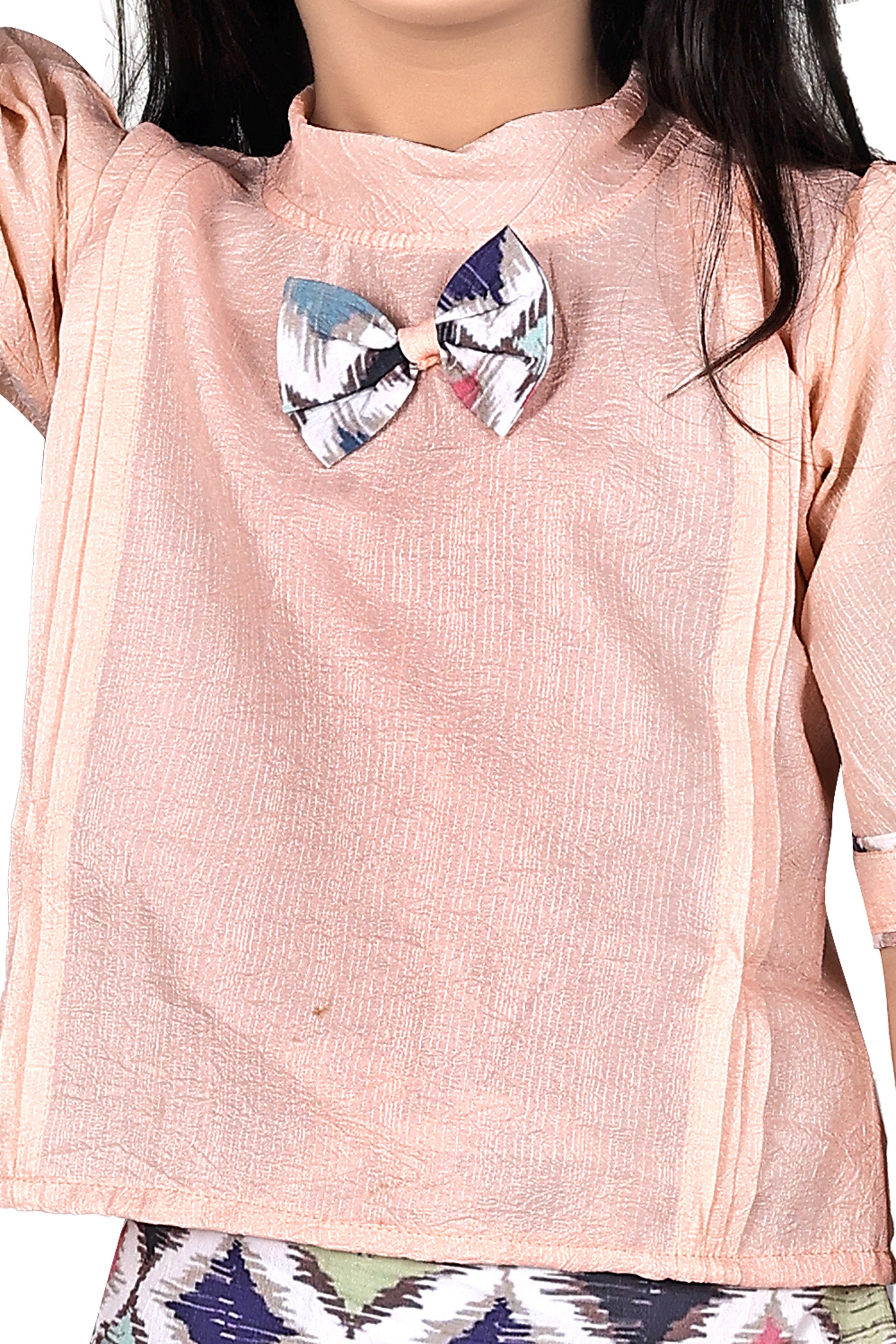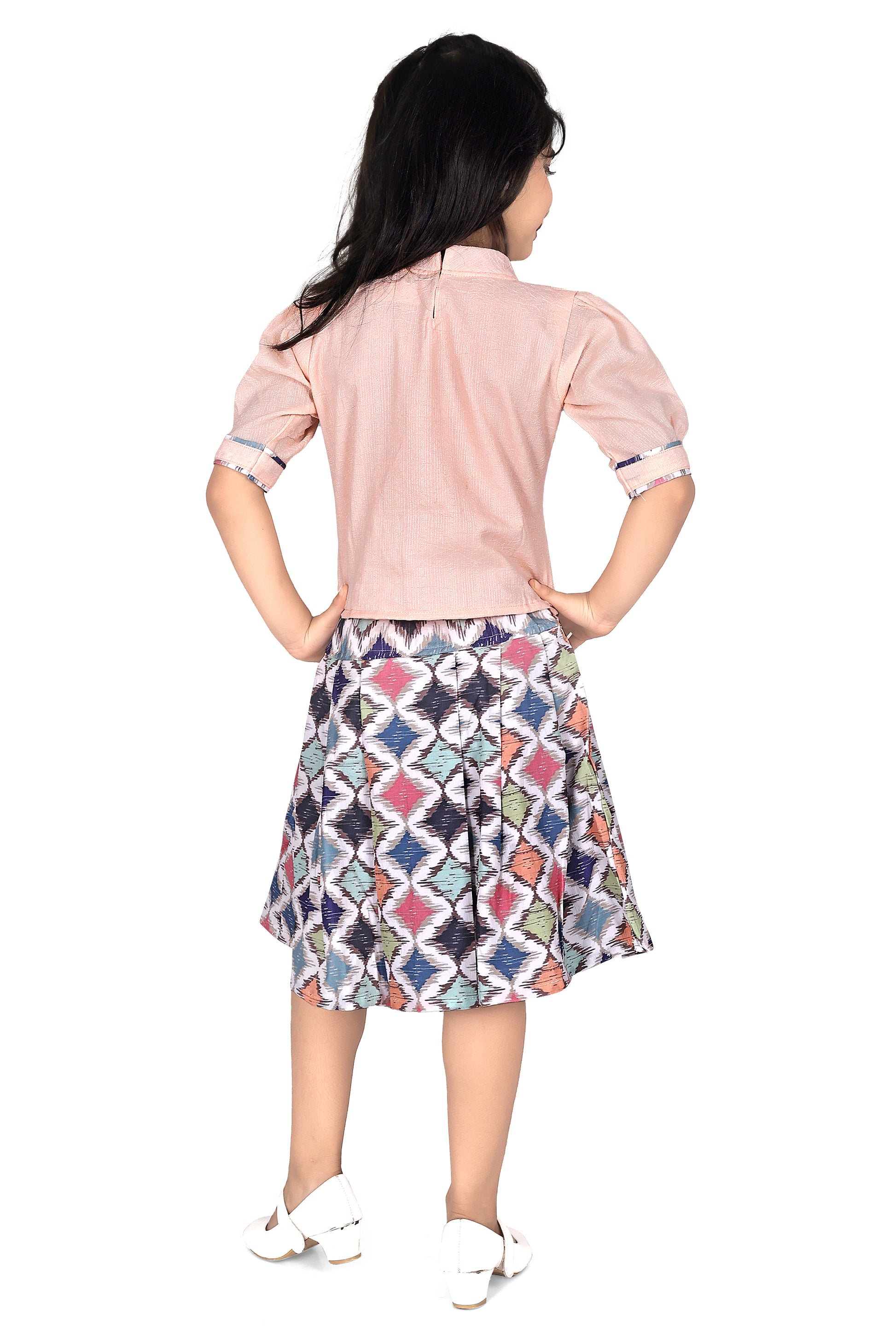 Peach top with short puff sleeve with Multicolour diamond skirt. It has cotton lining comfortable and breathable lining for your Fabangel.