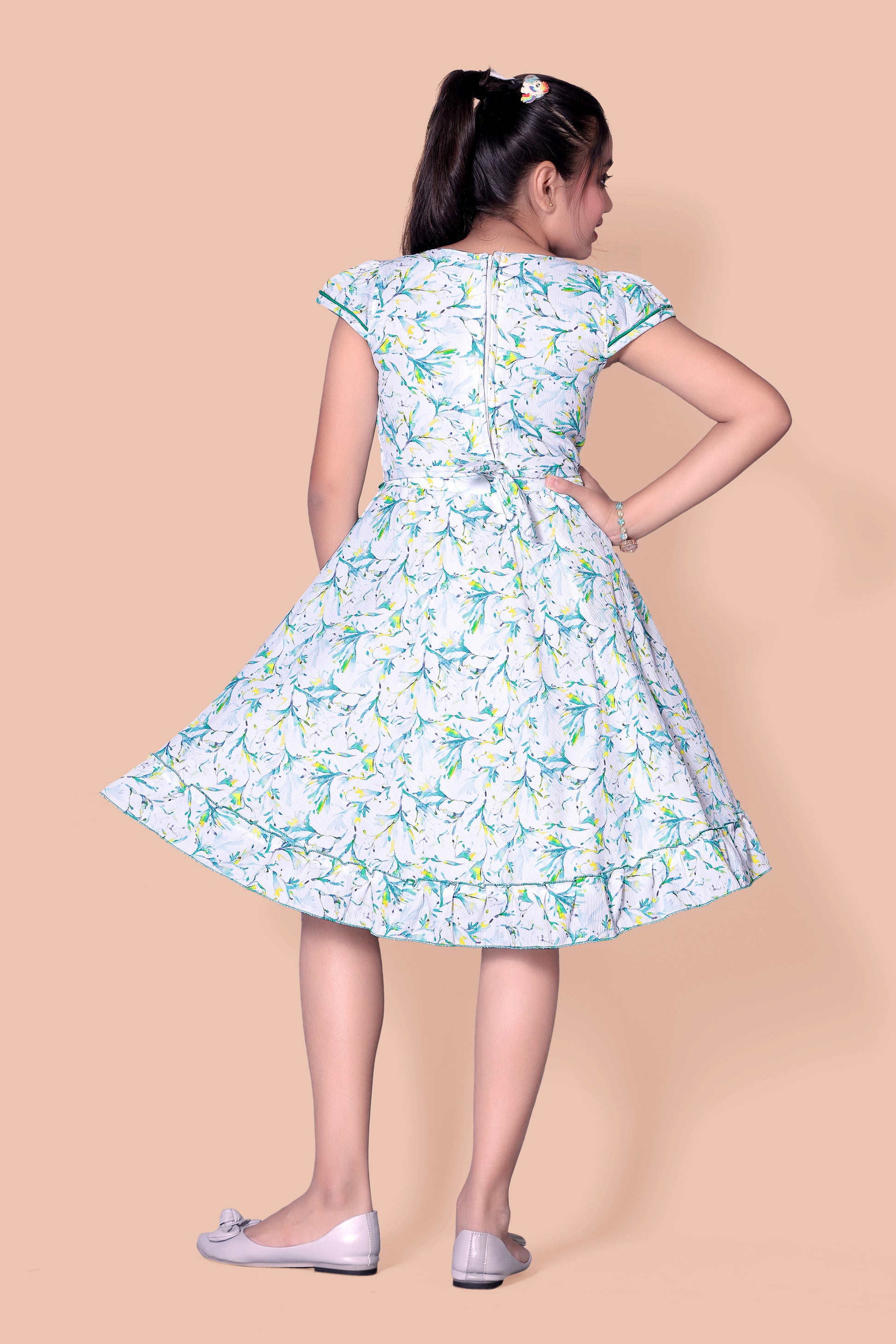 The frock have short sleeves, The neckline is in boat shape It may have a waistband detail, often in green, that accentuates the waist, or decorative elements like bows, ruffles, or lace trims for an extra touch of charm.